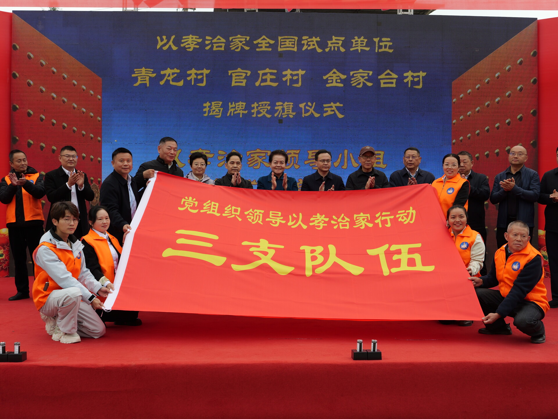 仪式上,吴红依次向官庄村、金家台村、青龙村授予“以孝治家全国试点单位”称号,以孝治家领导小组名誉主席宋京波、以孝治家义工秘书长李茂分别为三个试点村的基层党组织队伍、义工队伍、慈善企业家队伍授旗,以孝治家领导小组成员与出席县领导共同见证。