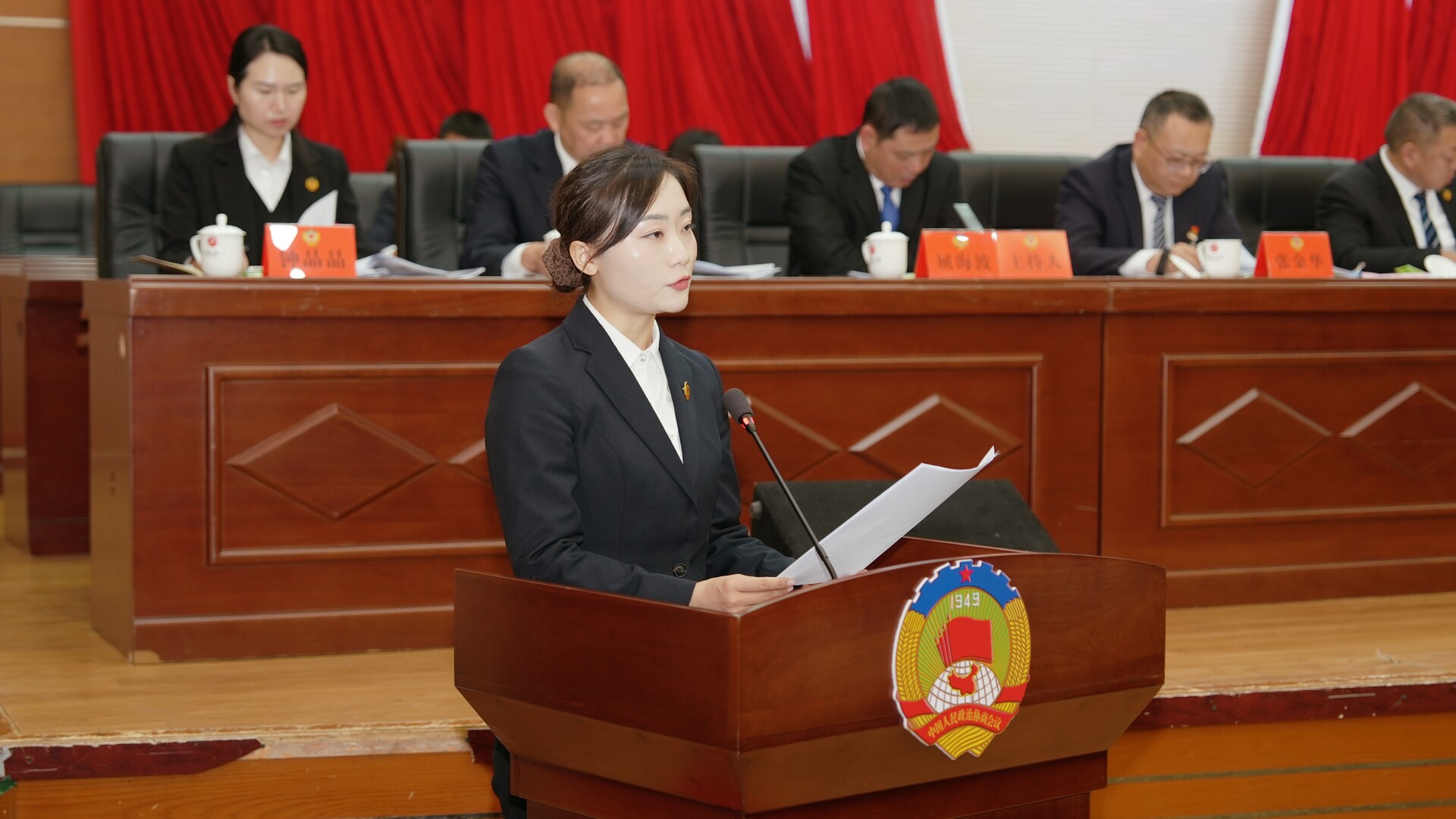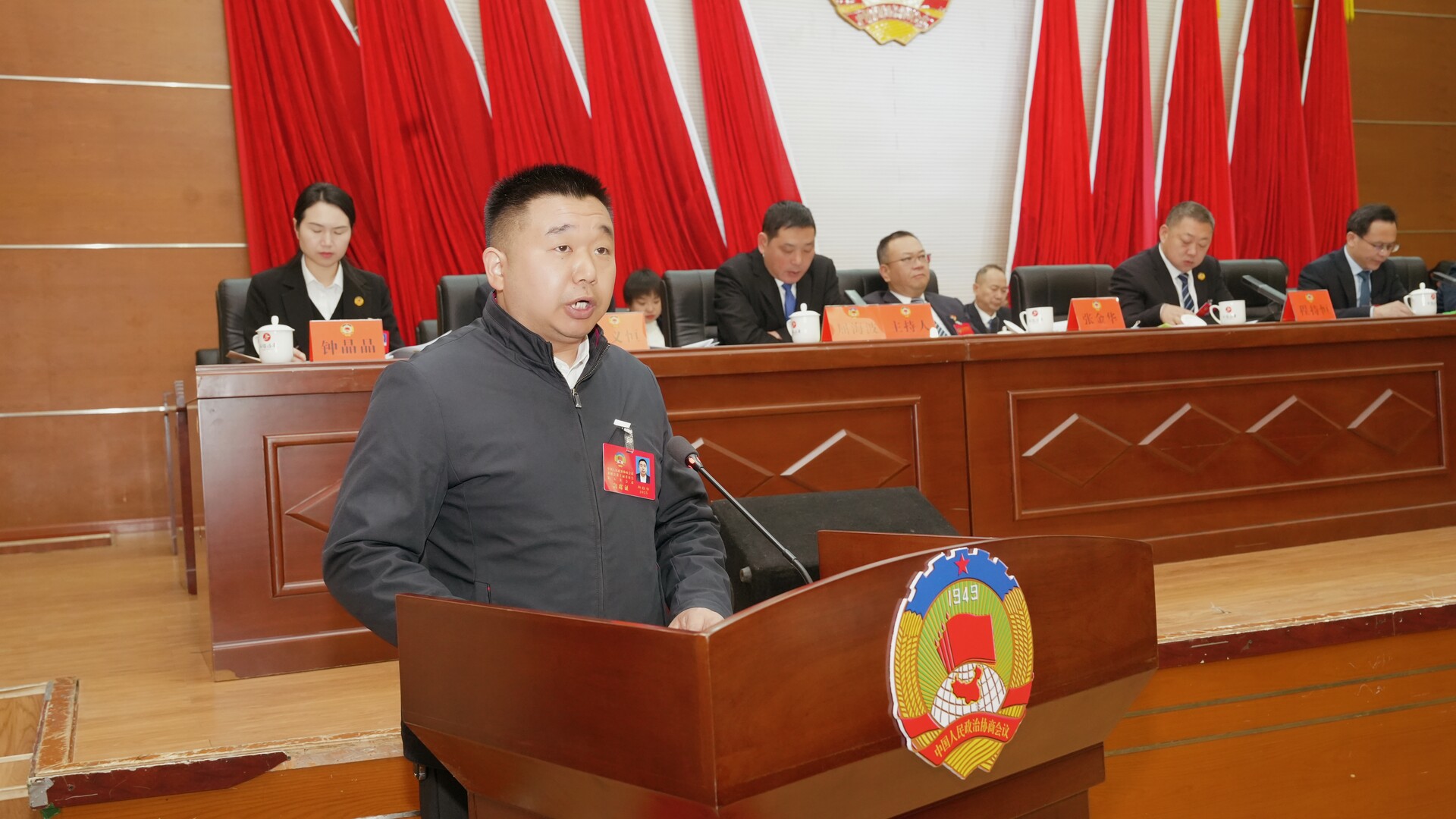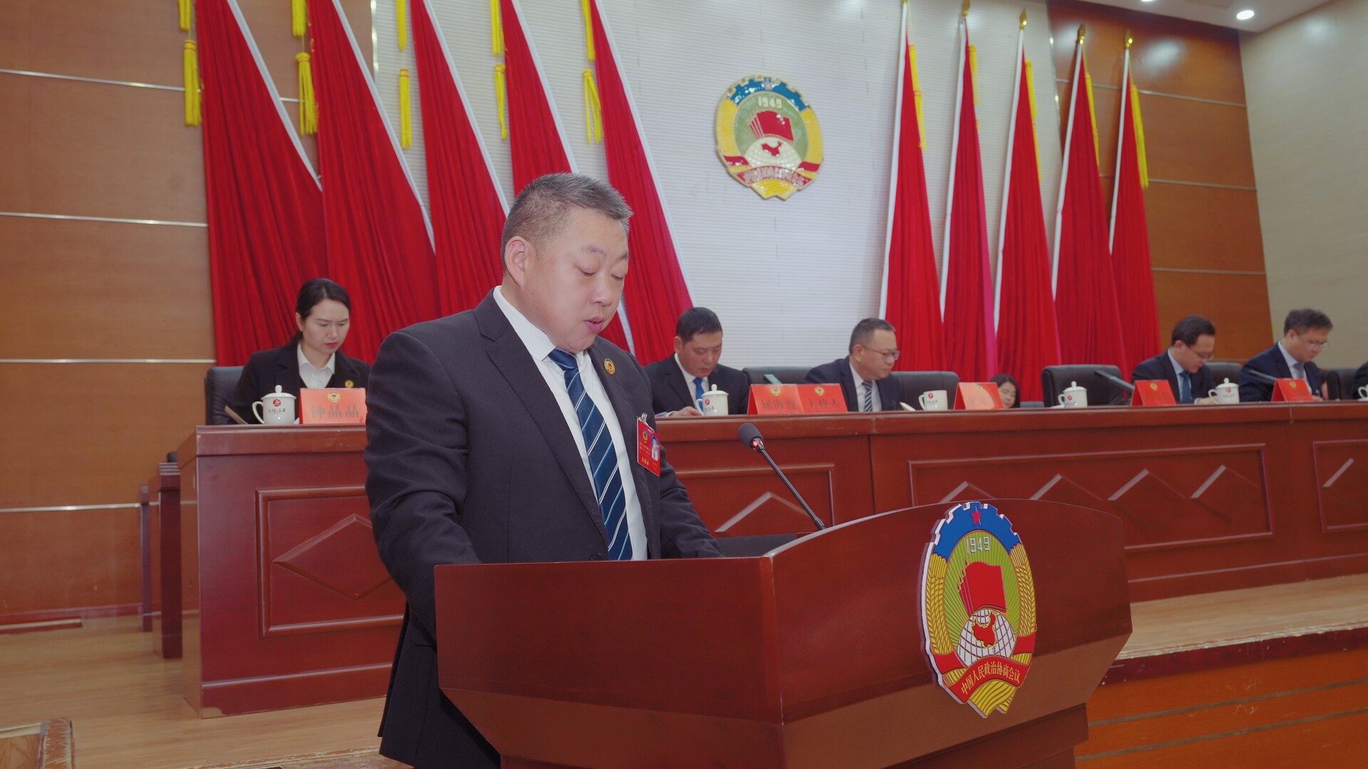 曹飞、梁高武、王兴树、杨绍武、程持恒、张交通、张金华、龚召君、屈海波、王建群、庄义恒、赵宾儒、钟晶晶在主席台前排就座,政协常委会成员在主席台就座。