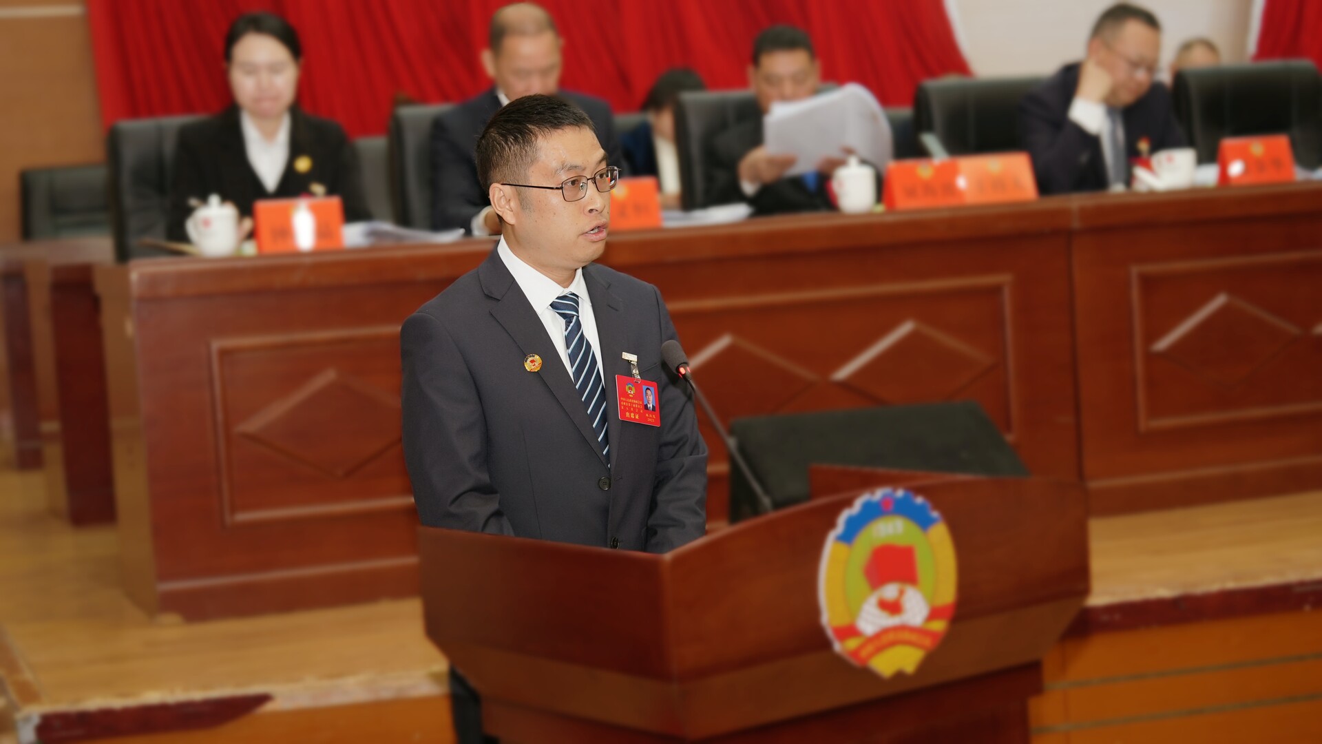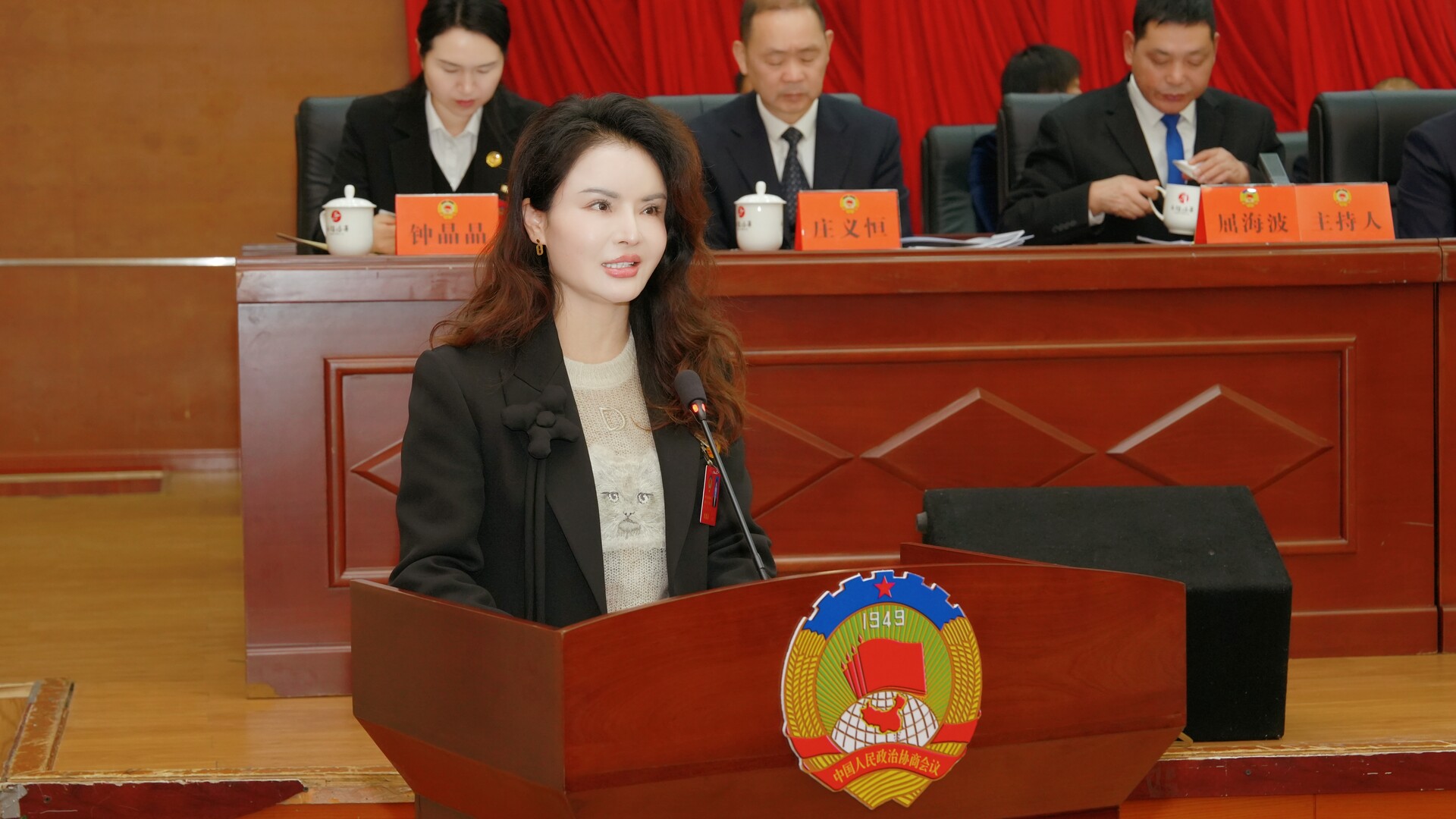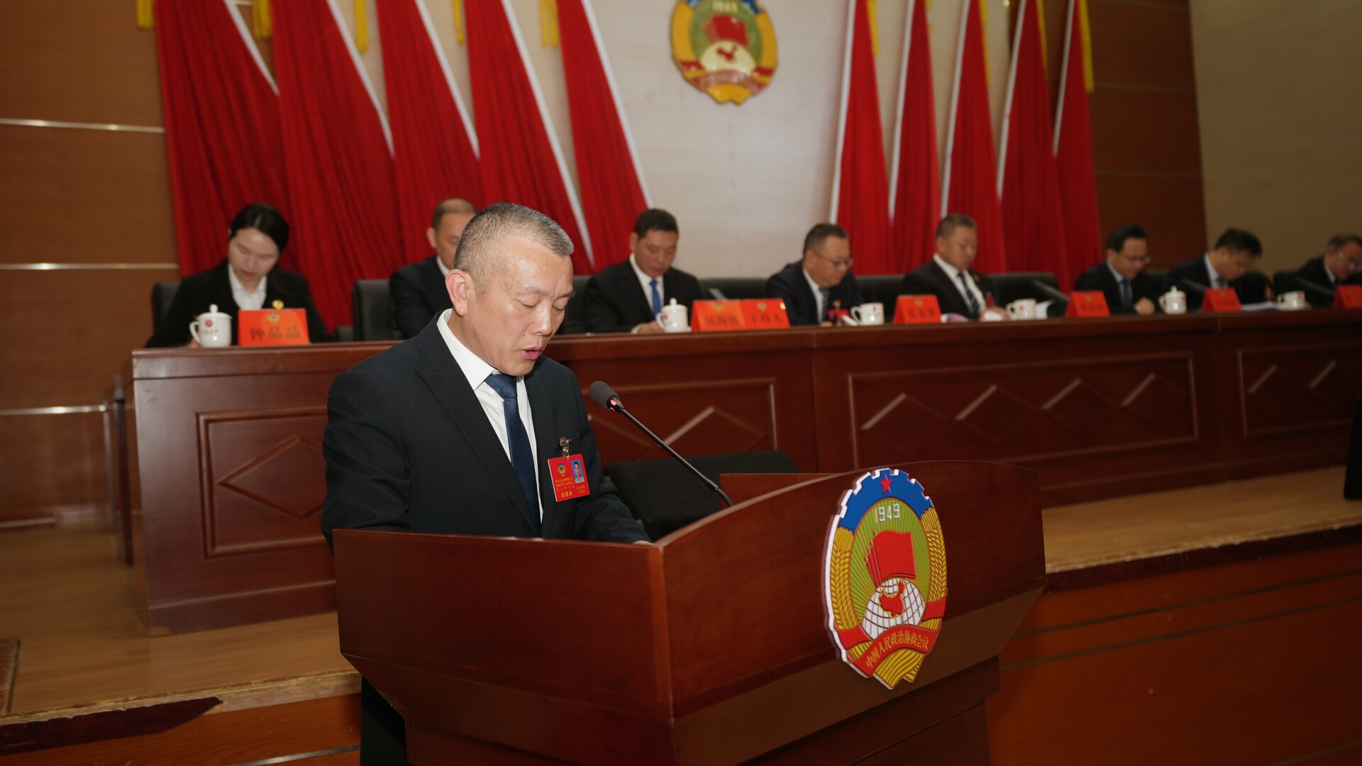 曹飞、梁高武、王兴树、杨绍武、程持恒、张交通、张金华、龚召君、屈海波、王建群、庄义恒、赵宾儒、钟晶晶在主席台前排就座,政协常委会成员在主席台就座。