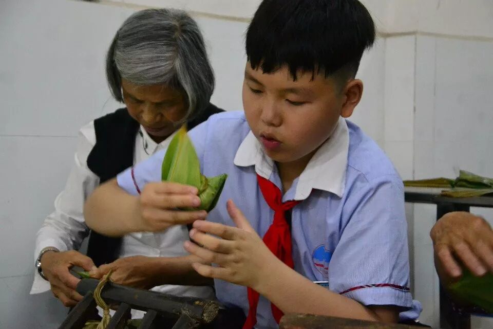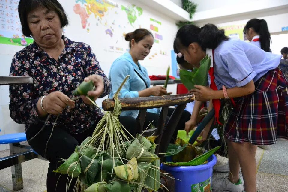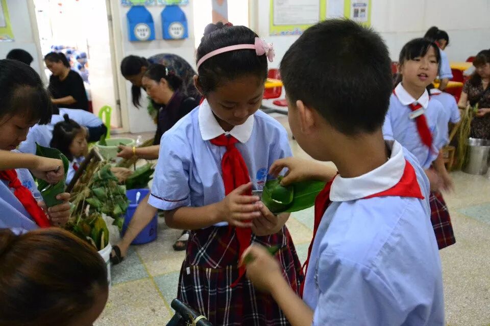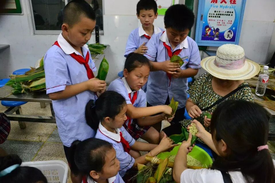 仪式结束后,五年级所有学生和家长齐上阵,带上早早准备好的食材和工具,在食堂包起了粽子。