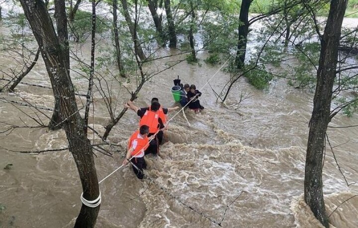 2022年4月28日下午1时25分左右,河边洗衣服的张某和他80岁的母亲被困在仁石溪河中间的高地上,洪水还在不断上涨。罗苏和寇凤雨听到呼救声后立马下水准备施救,罗苏小心试着往河中行进,因洪水湍急直接救援没有成功。罗苏马上要岸上的吴凤美打电话叫人带工具来救人。随后,罗苏、寇凤雨和随后赶来的民警但宗霖再次在水中展开救援。深的地方水已经到了救援人员的腰部,他们把绳子固定在河岸上,拉着绳子在河中摸索着前进,把绳子抛给张某。老太太终于被救上了岸。不料,张某因为没有抓稳绳子,被洪水冲走。好在,他抓住了河中的一根树枝,没被冲远。危急时刻,谭淼抱起一个救生圈,从近2米高的河岸上一跃而下,游向张某。终于,众人合力,成功从洪水中救起了母子2人。